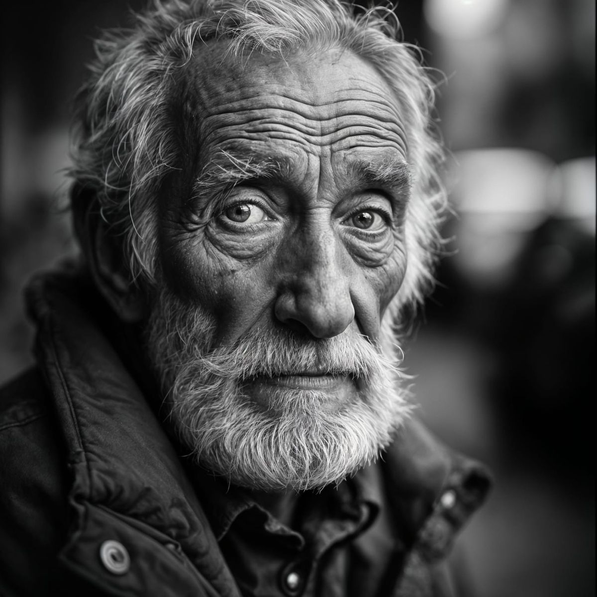 A poignant black and white portrait of an elderly man with a life of hard work and joy etched on his face, set against a softly blurred street background.