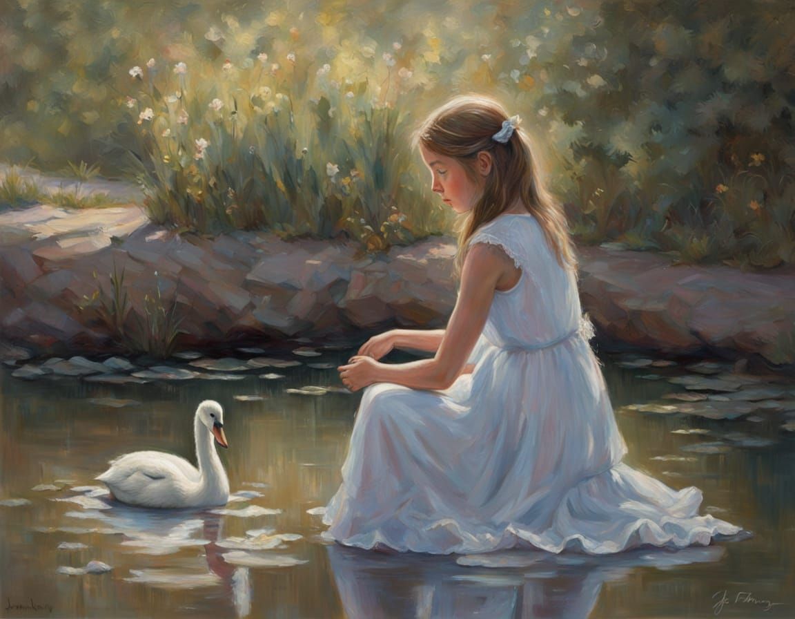 This image shows a young girl sitting by a calm lake, with a swan and paper boat. Rendered in realism with impressionistic touches and soft pastel colors, it evokes a serene mood.