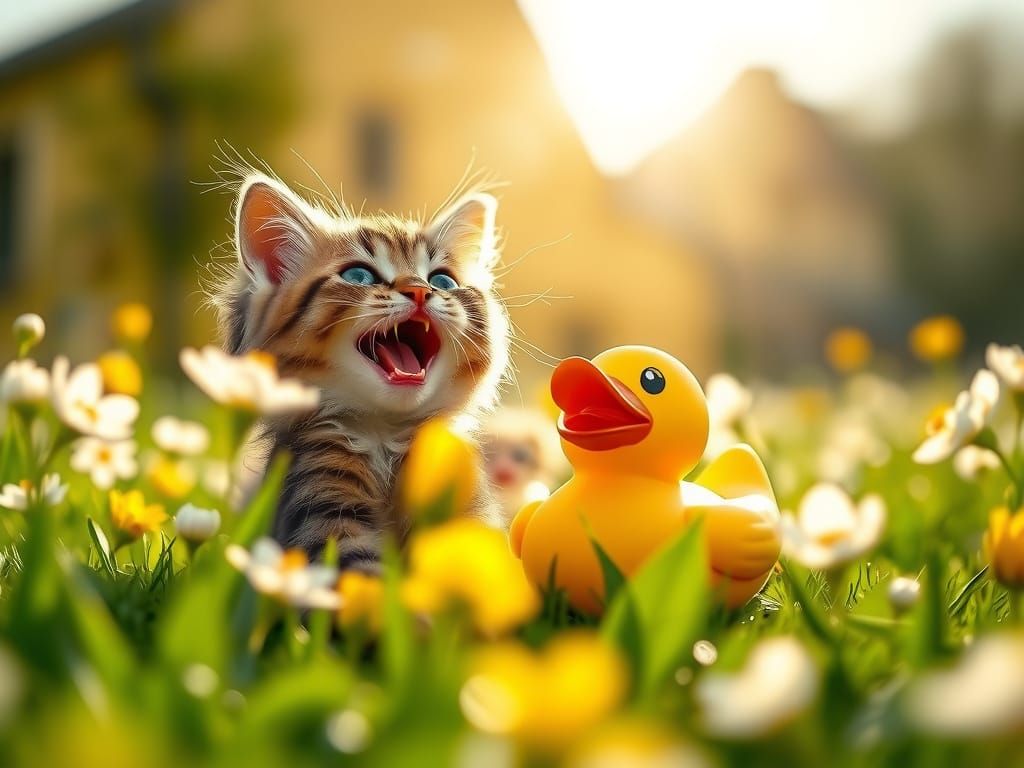 This image captures a joyful scene of a cute chibi cat and a rubber duck running together across a lush meadow filled with spring flowers, bathed in warm sunlight and vibrant colors.