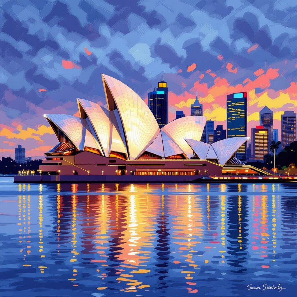 A breathtaking view of the Sydney Opera House at dusk. The iconic sails are brilliantly lit, with reflections shimmering on the water in an impressionistic style.