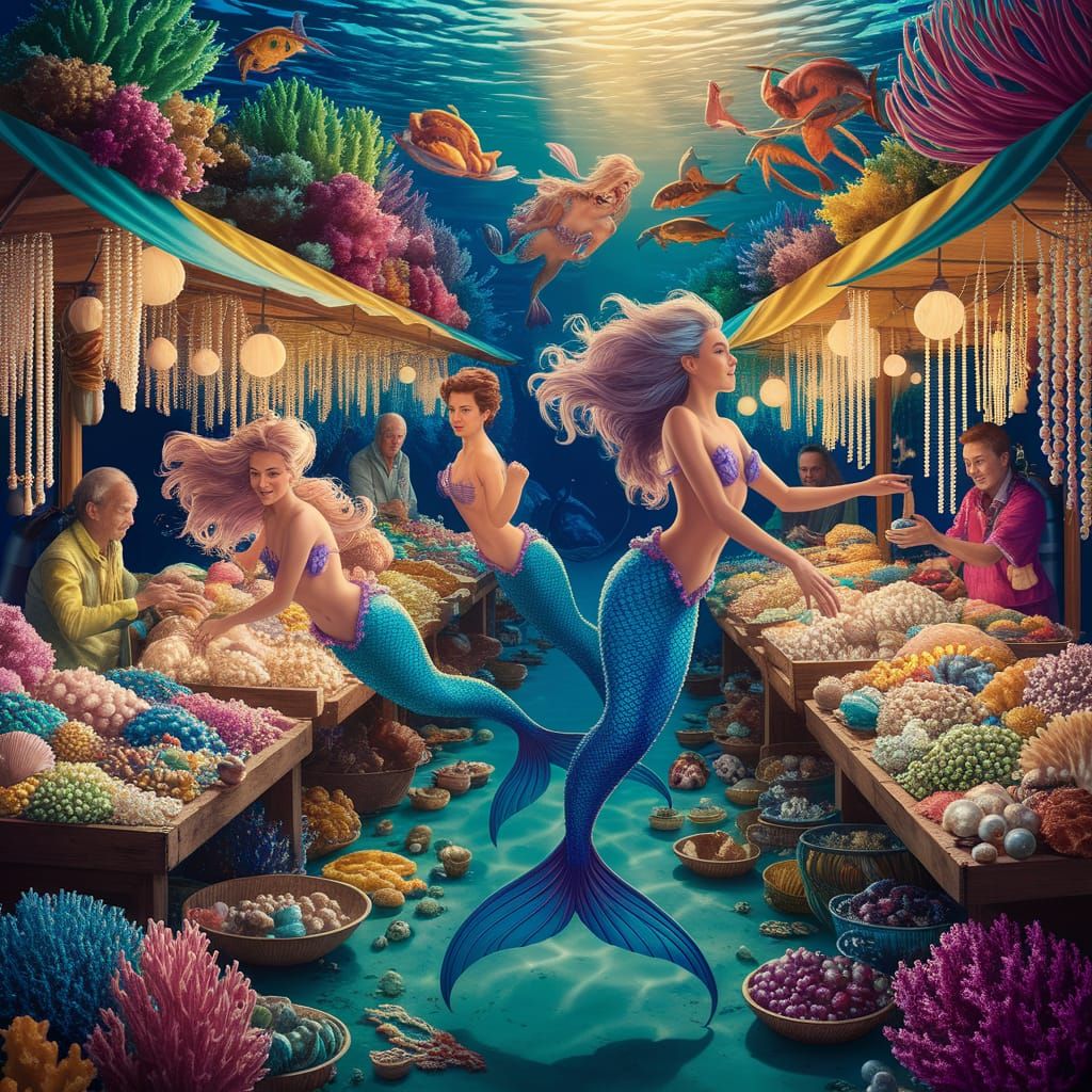 This image shows a vibrant underwater market in a coral reef, teeming with mermaids and humans trading exotic goods. The scene is awash in bright blues, greens, and yellows, reminiscent of Southeast Asian markets.