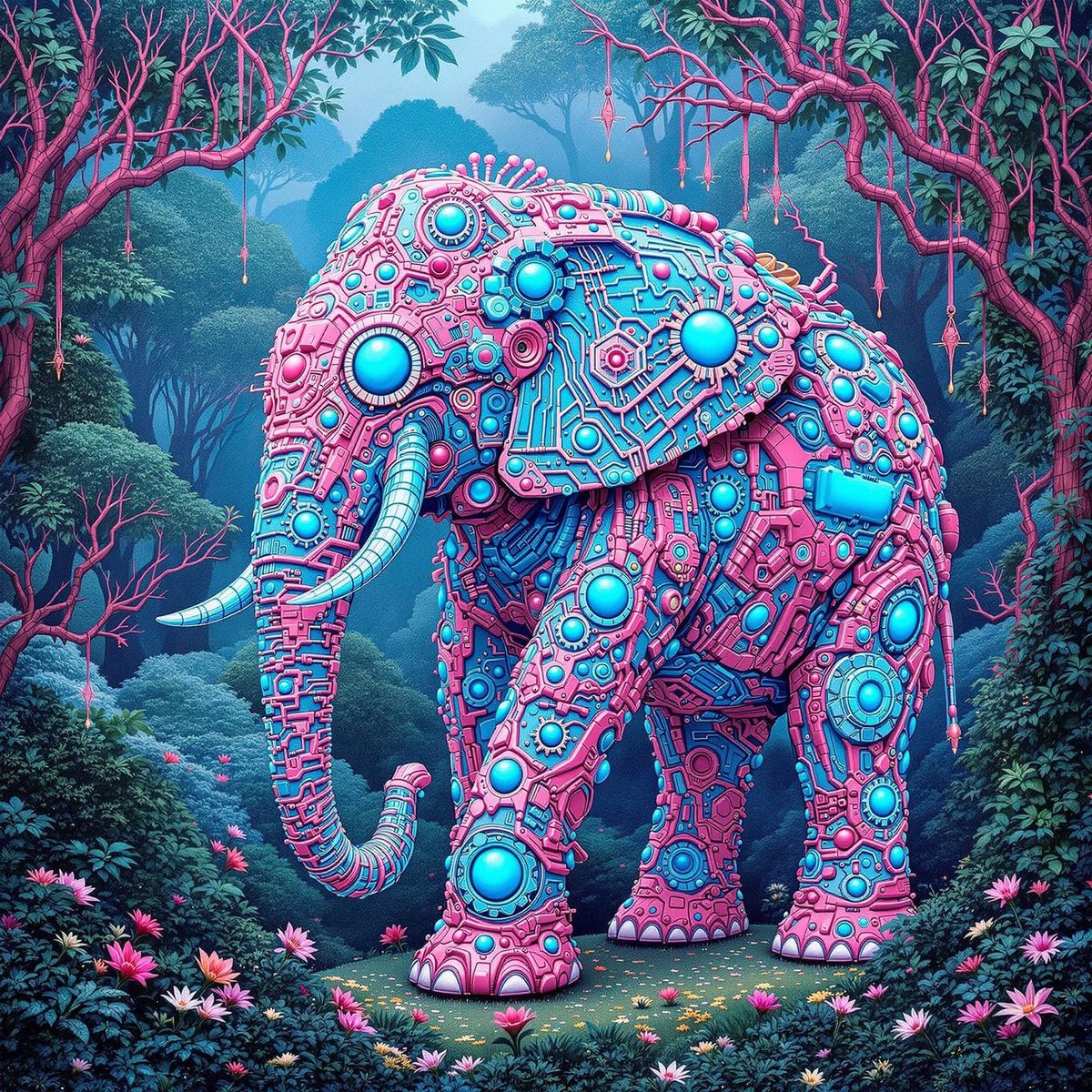 This image depicts a mystical, biopunk elephant in a vibrant, dreamy environment, blending Afrofuturist and cyberpunk elements with intricate, glowing circuitry and 3D embroidery.