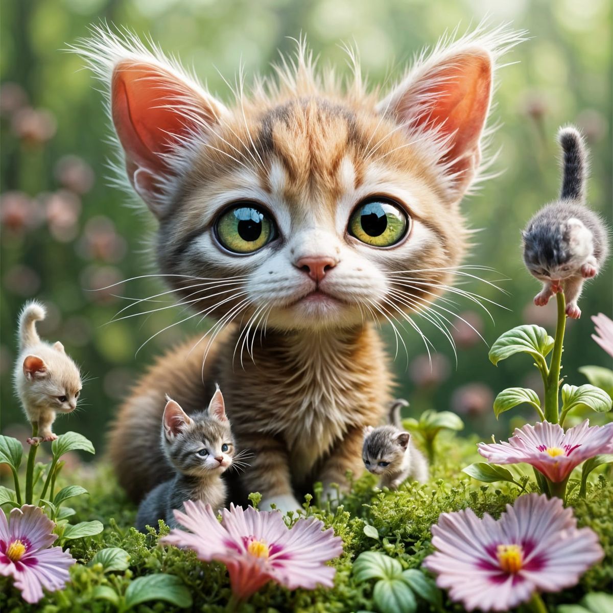 This image shows a tiny pearl cat surrounded by many kittens of various types. The artwork features fractal edging, 3D complexity, and intricate details.
