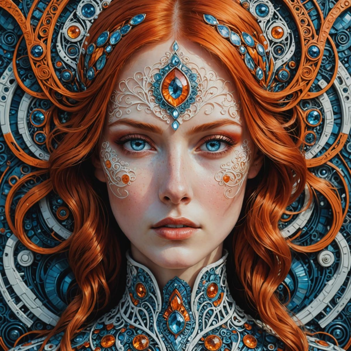 This image is a stunning example of a hyperrealistic digital portrait, featuring intricate patterns and vibrant colors on a woman's face. Her white skin and blue eyes are surrounded by a halo of orange hair, with red and orange patterns adding to the surreal, dreamy effect.