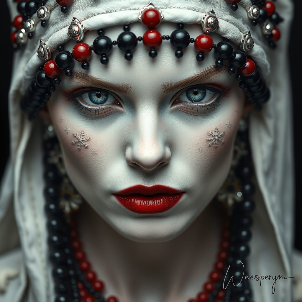 This image shows a woman with porcelain skin and piercing blue eyes, wearing an intricate headpiece with black and red beads and silver sequins, set against a subtle, shimmering makeup background, exuding regal elegance and mystique.