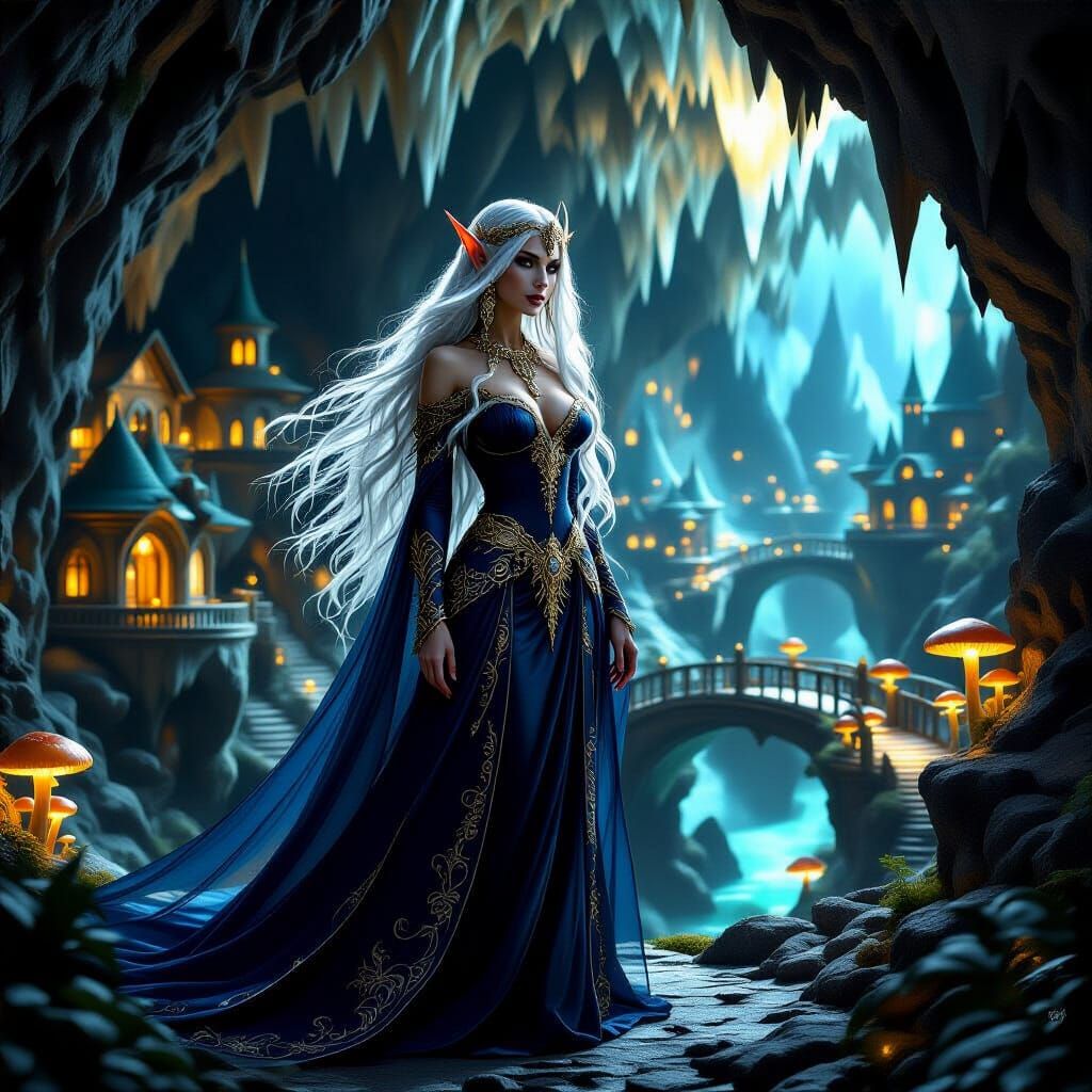 A stunning portrait of a dark elf queen in an underground city. The queen has long silver hair and wears a midnight-blue gown with gold embroidery. The image has dramatic lighting in a fantasy style.