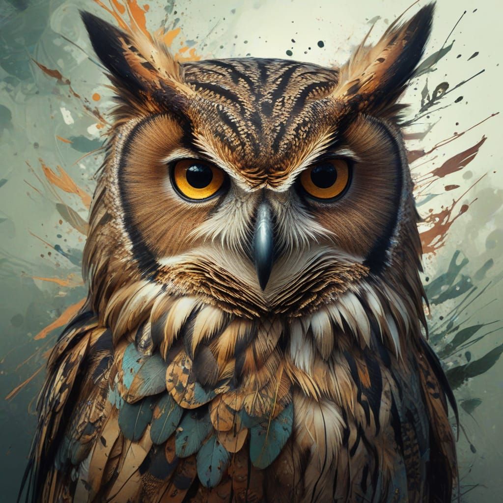 Portrait a Owl Genuine Owl portrait of Mysterious Owl swirling forest !! :: breathtaking Owl cover art Artwork, perfect 32 k by 88, Jon Foster, Carne Griffiths, Camilla D'Errico, Jean Baptiste Monge, Guweiz, insanely detailed, speedpaint with large brush strokes and paint splatter, triadic colours,