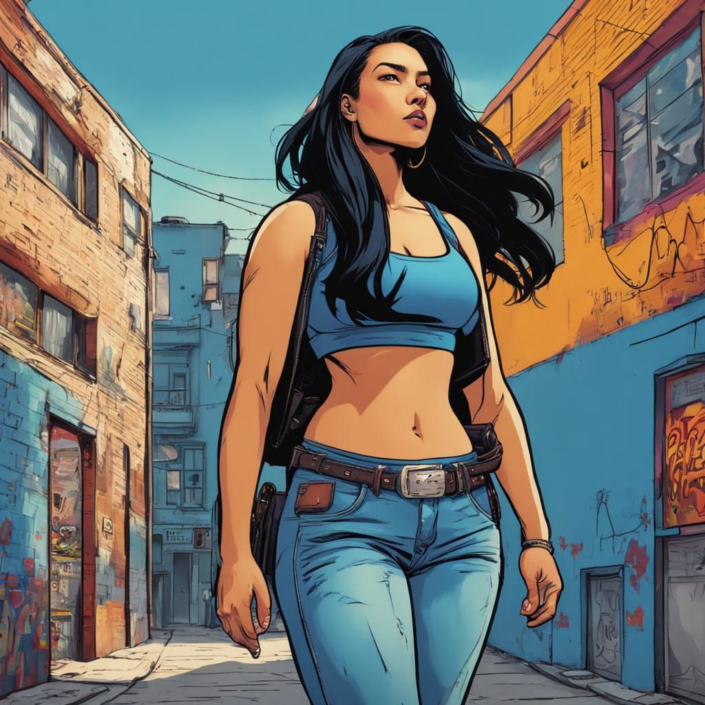 This image shows a plus-sized Latina woman in a vibrant urban setting. The graphic novel style art features dynamic shading, bright colors, and bold lines reminiscent of comic book art.