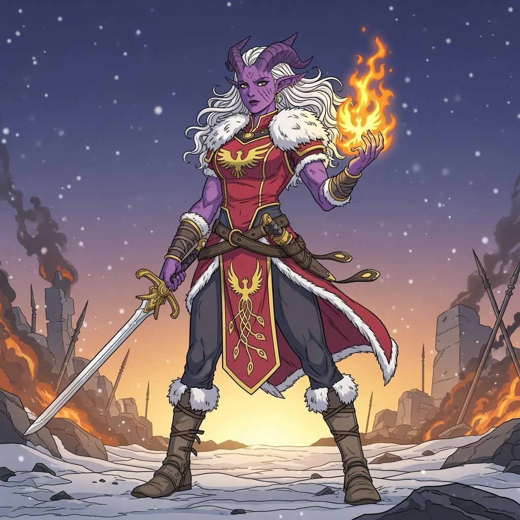 A striking picture of a confident tiefling sorceress on a battlefield. The character has purple skin, white hair and is holding a phoenix flame with ruins and a sunset in the background. Rendered in a dynamic anime comic style.