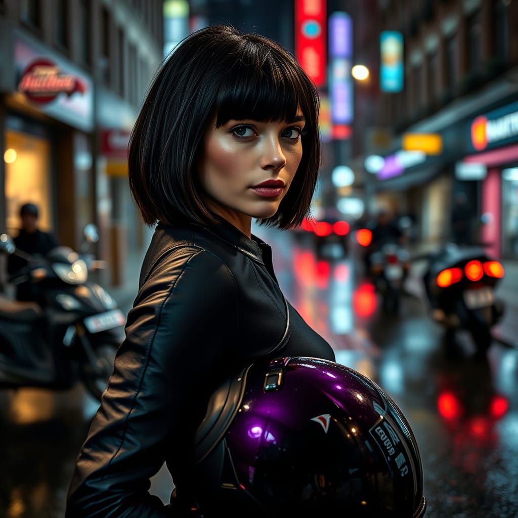 This hyperrealistic image shows a stunning French woman with dark hair, wearing a leather jumper and holding a motorcycle helmet on a wet city street at night, with moody, cinematic lighting.
