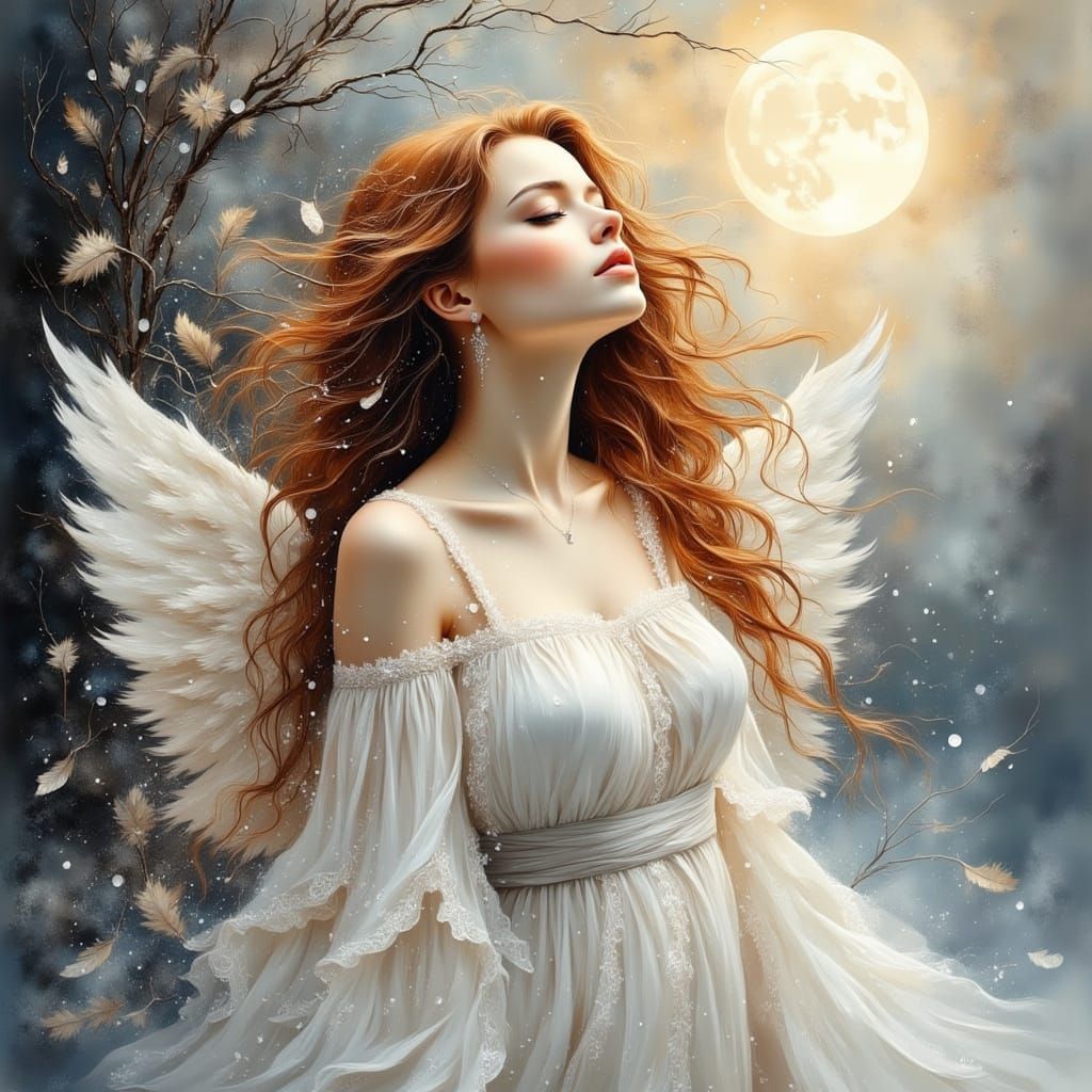 This image depicts a woman with brownish-red hair wearing white, looking up at the moon as angelic feathers fall like snow. Rendered with hyperrealistic detail and dramatic lighting.