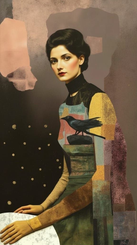 This image features a surreal mixed media collage of a woman in an intricate dress with a black bird print. The background blends vintage paper and watercolor washes with gold accents, evoking a dreamlike atmosphere.