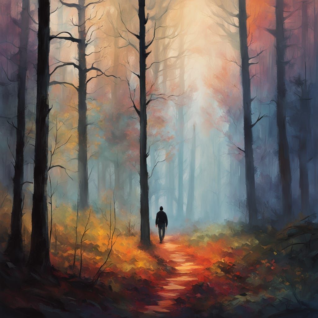 This image depicts a lone figure in a misty forest at sunrise, rendered as an impressionistic oil painting with thick impasto brushstrokes and a vibrant, Tarkovsky-inspired color palette. Dynamic backlighting creates an atmospheric glow.