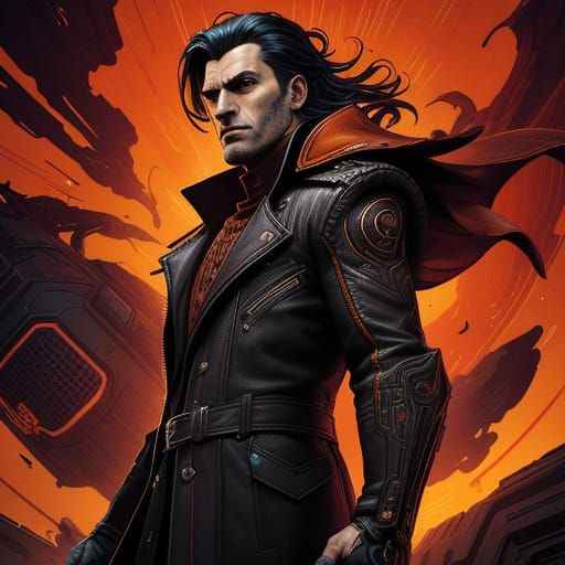 This striking image showcases a sci-fi interpretation of a batina reimagined as a leather coat, featuring intricate line work and dynamic shadows in vibrant orange and deep purple tones.