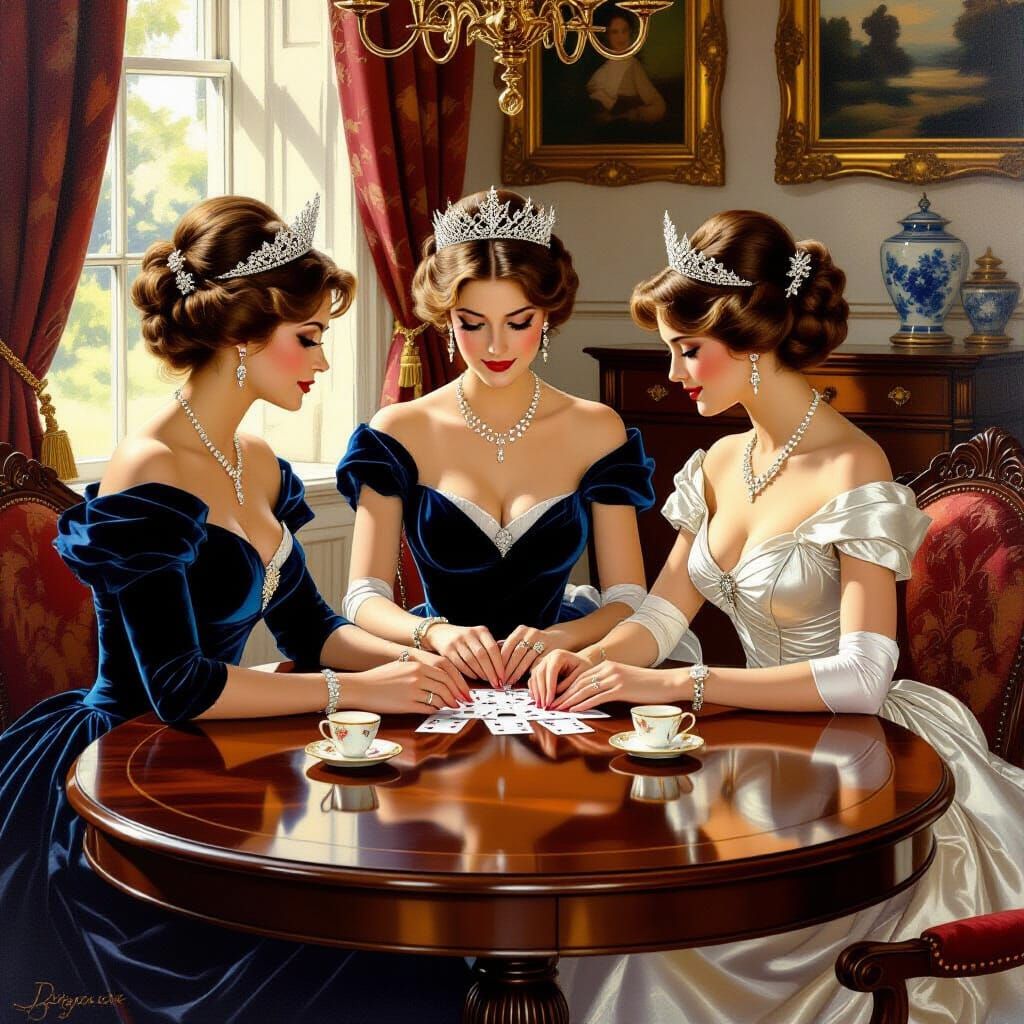 This image shows a queen and her princesses playing bridge around a mahogany table. The gouache painting captures soft light, rich textures, and familial warmth in a style reminiscent of classical realism.