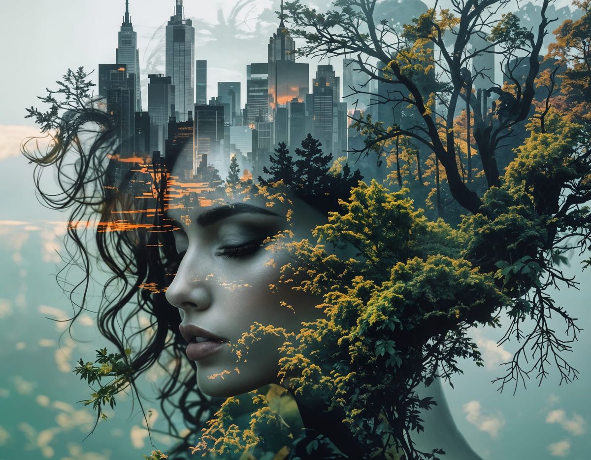 The image creates a "living city" metaphor that feels both tranquil and complex. It suggests that the city and the forest are not just "on" her, but within her.