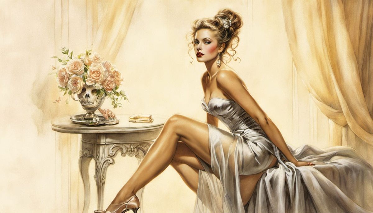 This image shows a woman in a dressing room in a sensual pin-up art style. The image uses golden lighting and pastel colors to highlight the delicate silk and rich shadows.