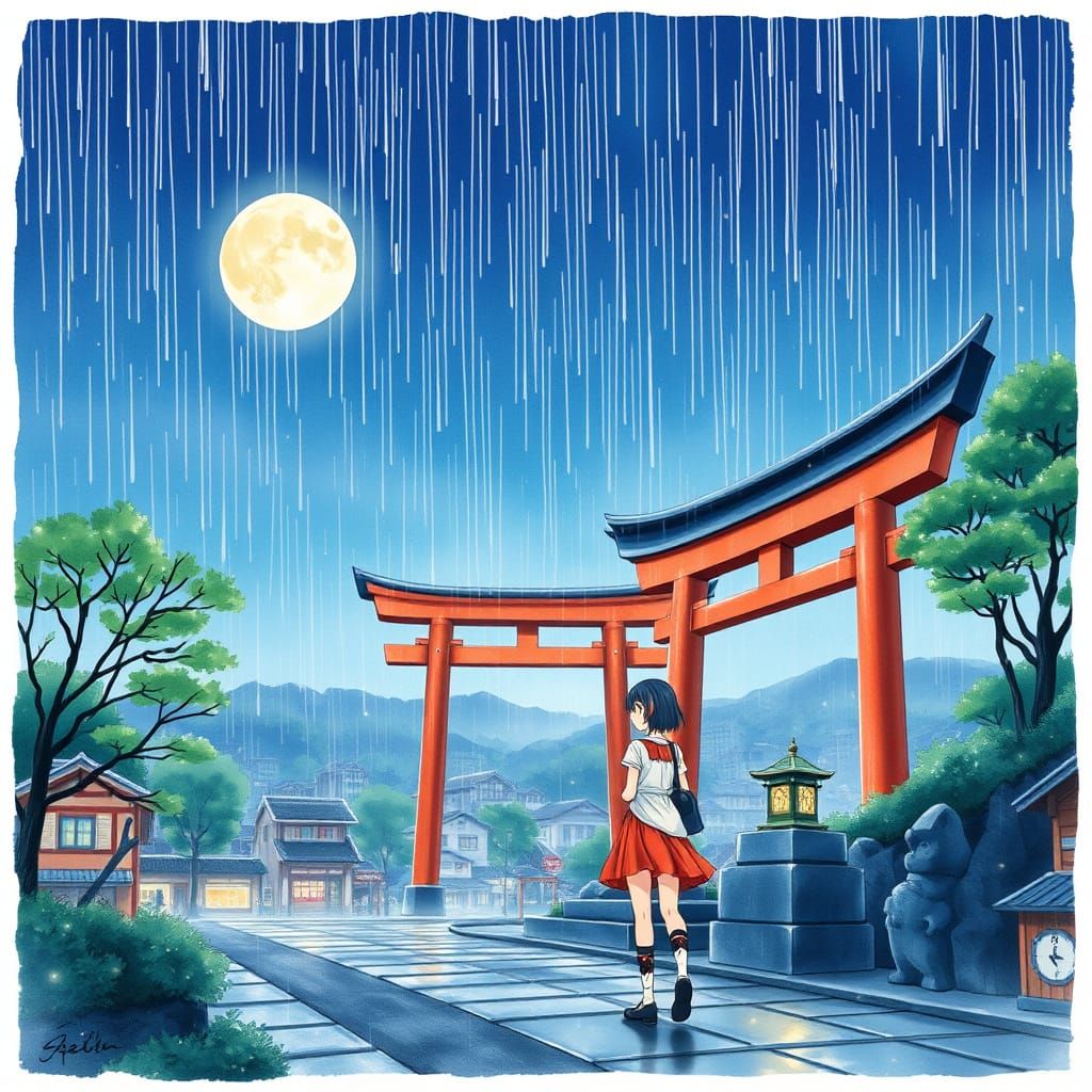This enchanting watercolor image captures a serene moment of girls strolling under the bright full moon in a small Japanese town, surrounded by ancient torii gates, lush trees, and twinkling fireflies, evoking the whimsy of Studio Ghibli's style.