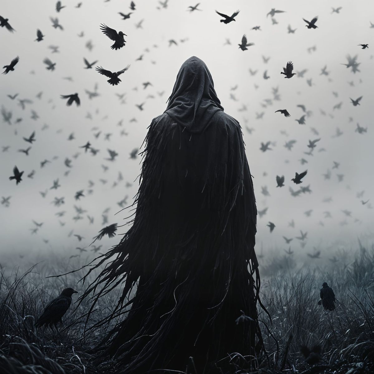 This striking image shows a tall, hooded wraith on a windswept moor, with a flock of ravens exploding into the sky. Rendered in high-contrast black and white with a cinematic matte-painting style.