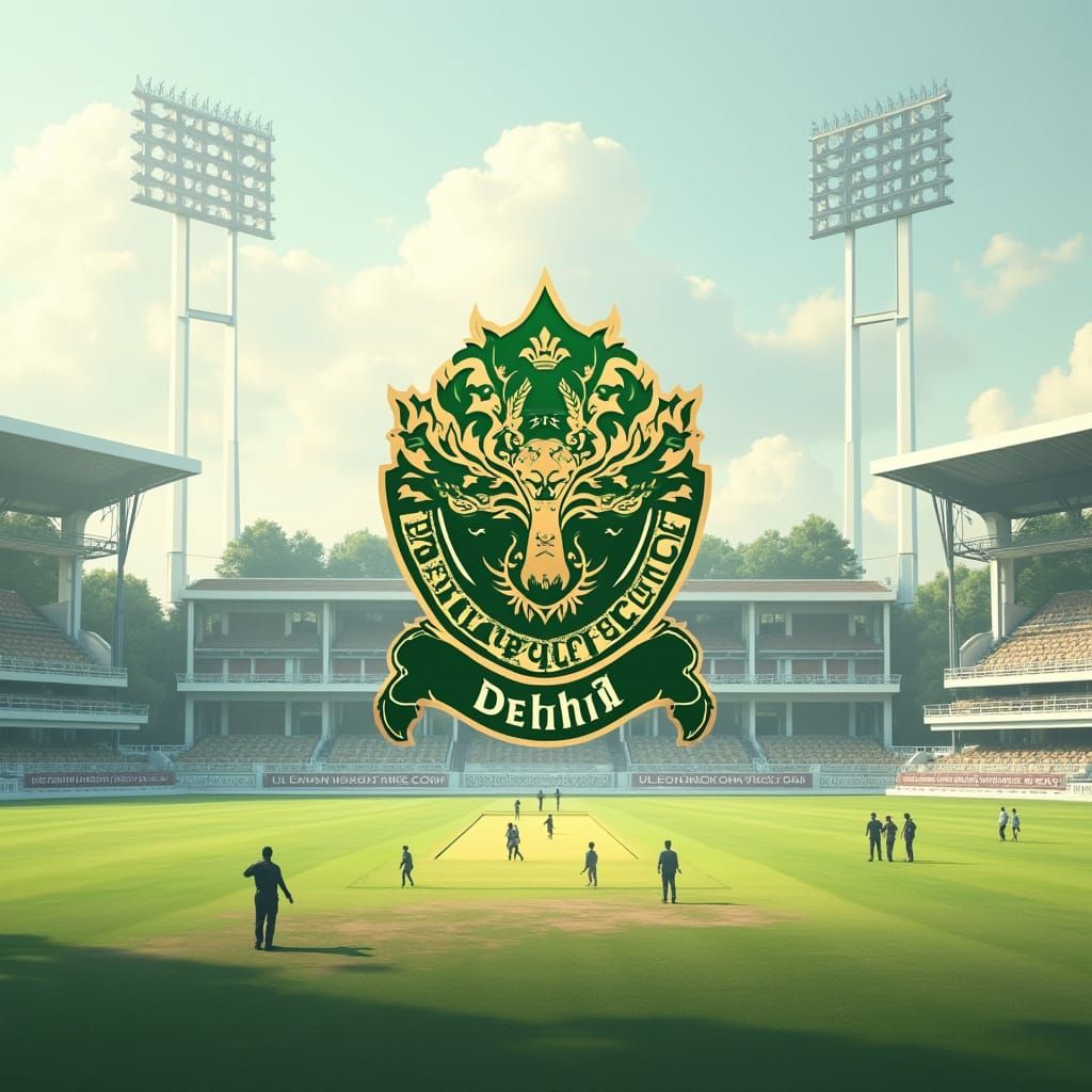 This image is a fantasy concept art of a cricket academy, featuring a cricket field with a prominent Delhi Public School logo on a white and green background, showcasing professional coaches training students in a detailed and intricate environment, inspired by the styles of Simon Stalenhag, Noah Bradley...