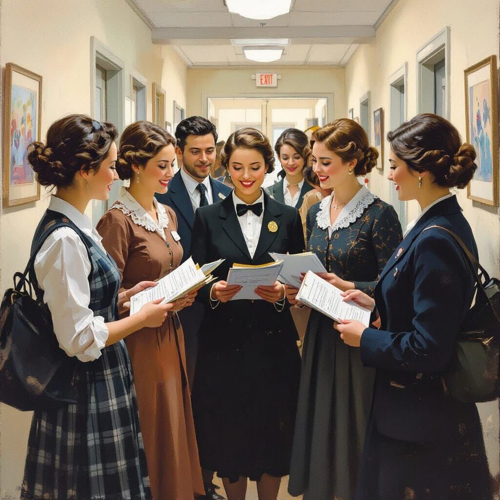 This image shows teachers in elegant clothes handing out schedules in a school hallway. The scene captures various emotions through realistic details and vivid colors, in an expressive, impressionistic style.