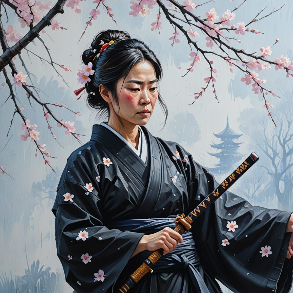 This image shows a Japanese woman in traditional robes holding a katana. Cherry blossoms float around her in this neo-impressionist style oil painting with thick brush strokes.