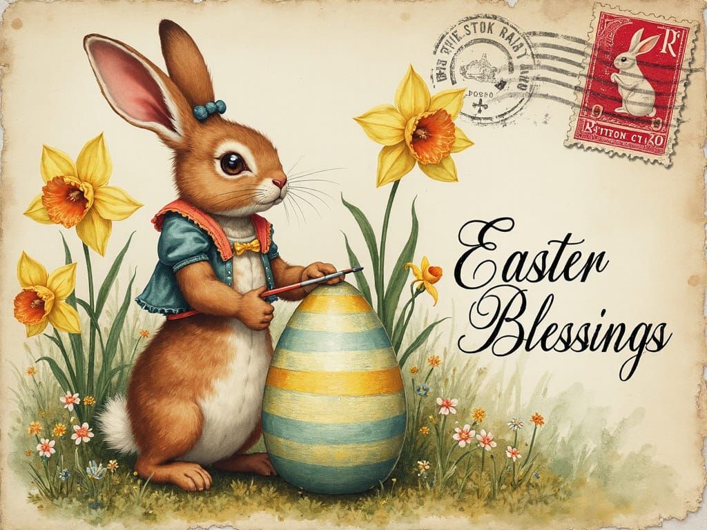 This enchanting watercolor painting depicts a tall Easter Bunny in Victorian attire, delicately painting stripes on a large egg amidst a vintage floral background, complete with daffodils and elegant cursive writing. The artwork exudes a sense of history and nostalgia, reminiscent of antique postcards.