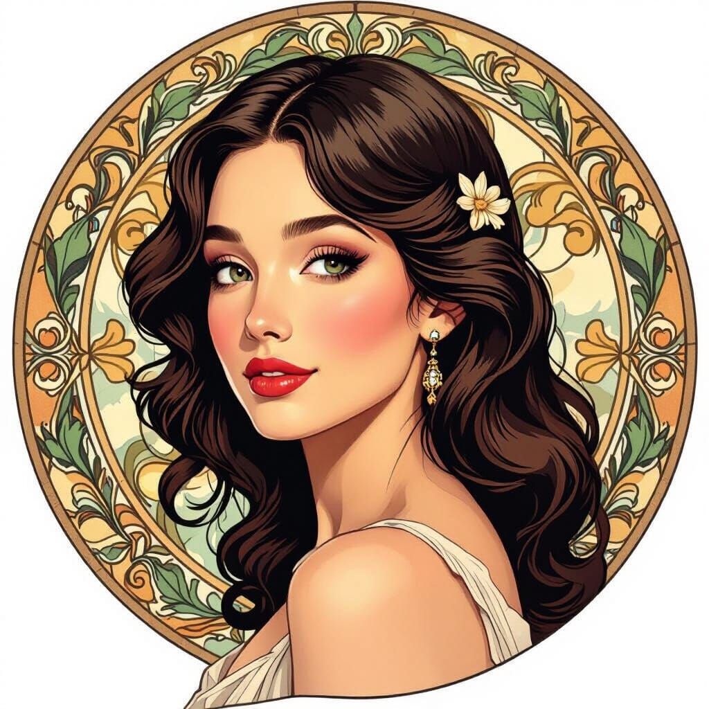This image features a woman with a soft, expressive face, deep eyes, and naturally voluminous wavy hair. She has a tender smile and a delicate style with creative touches.