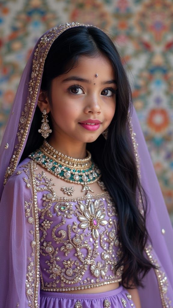 This image shows a 10-year-old girl in a stunning, traditional Islamic bridal gown with intricate stonework and geometric patterns, adorned with sparkling gemstones and rhinestones, and dramatic eye makeup and lipstick.