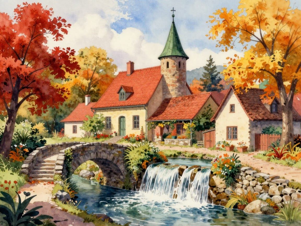 This image depicts a charming European village in autumn, featuring a multi-storied cottage with a turret, a stone bridge over a waterfall, and vibrant fall foliage. Rendered with expressive watercolor brushstrokes.