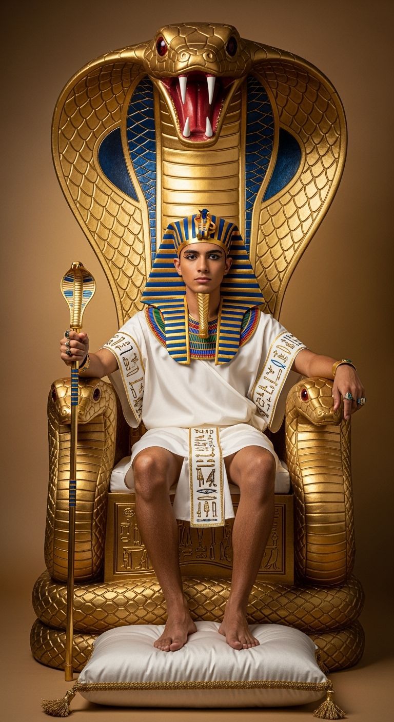 This image shows a young Egyptian Pharaoh sitting barefoot on a massive golden throne shaped like a King Cobra. He wears a gold toga and cobra crown, holding a scepter in a photograph with natural lighting.
