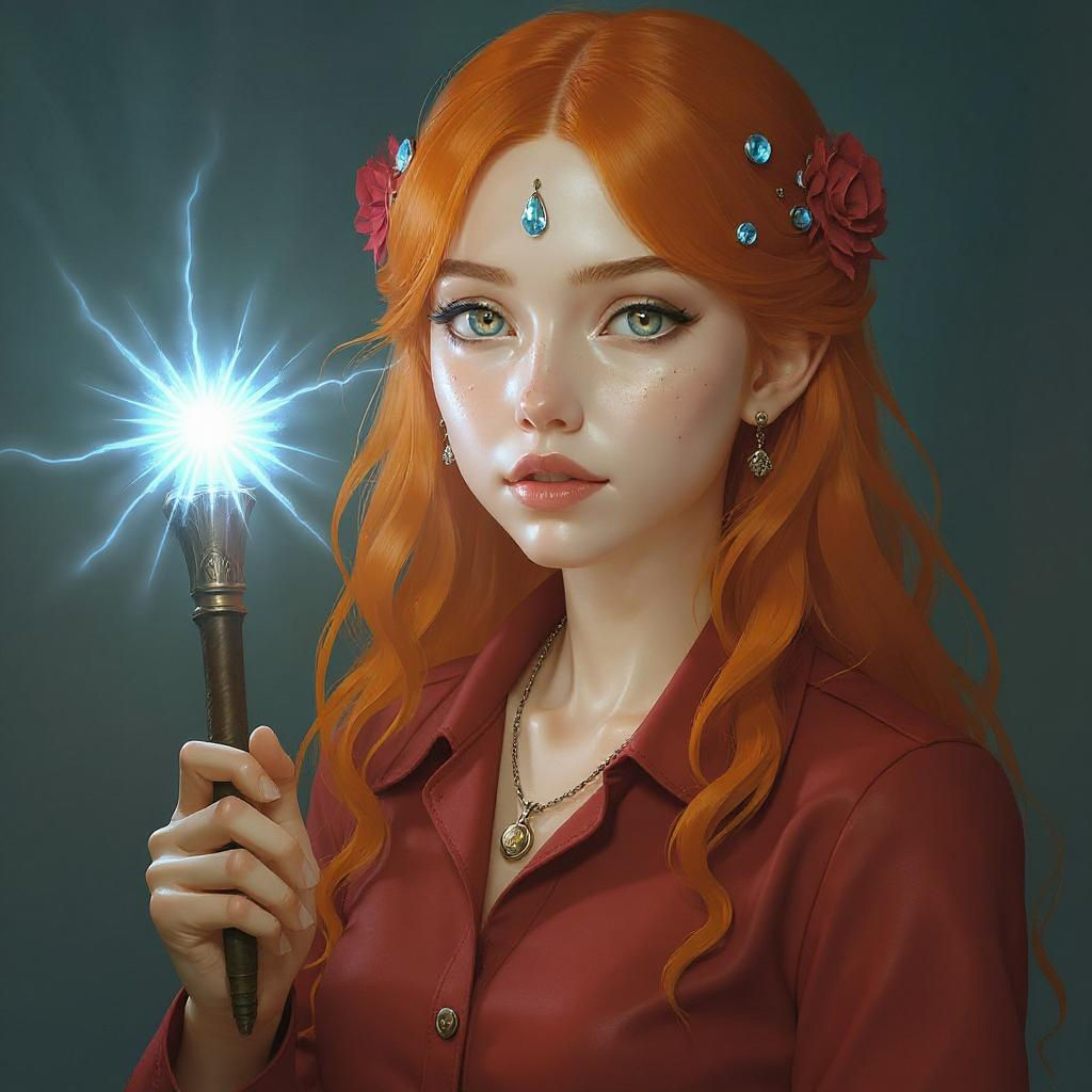 A detailed portrait of a girl with orange hair and freckles in a Gryffindor uniform, holding a wand in the potions room. This image is a hyperdetailed digital painting.