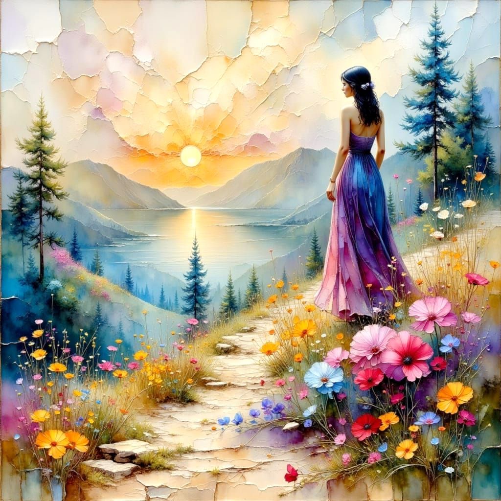 A colorful representation of freedom, featuring a mix of natural landscapes and emotive brushstrokes, in a crinkled metallic and pastel aesthetic