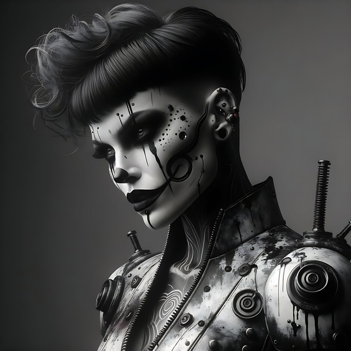 A striking image of a woman blending circus and cyberpunk elements, featuring a unique fusion of colorful and gritty aesthetics.