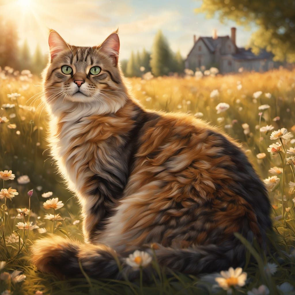 This image shows many cats lounging in a sunlit, wildflower-filled meadow, depicted in a whimsical oil painting style. The fantasy illustration has a cinematic quality with soft, warm lighting.