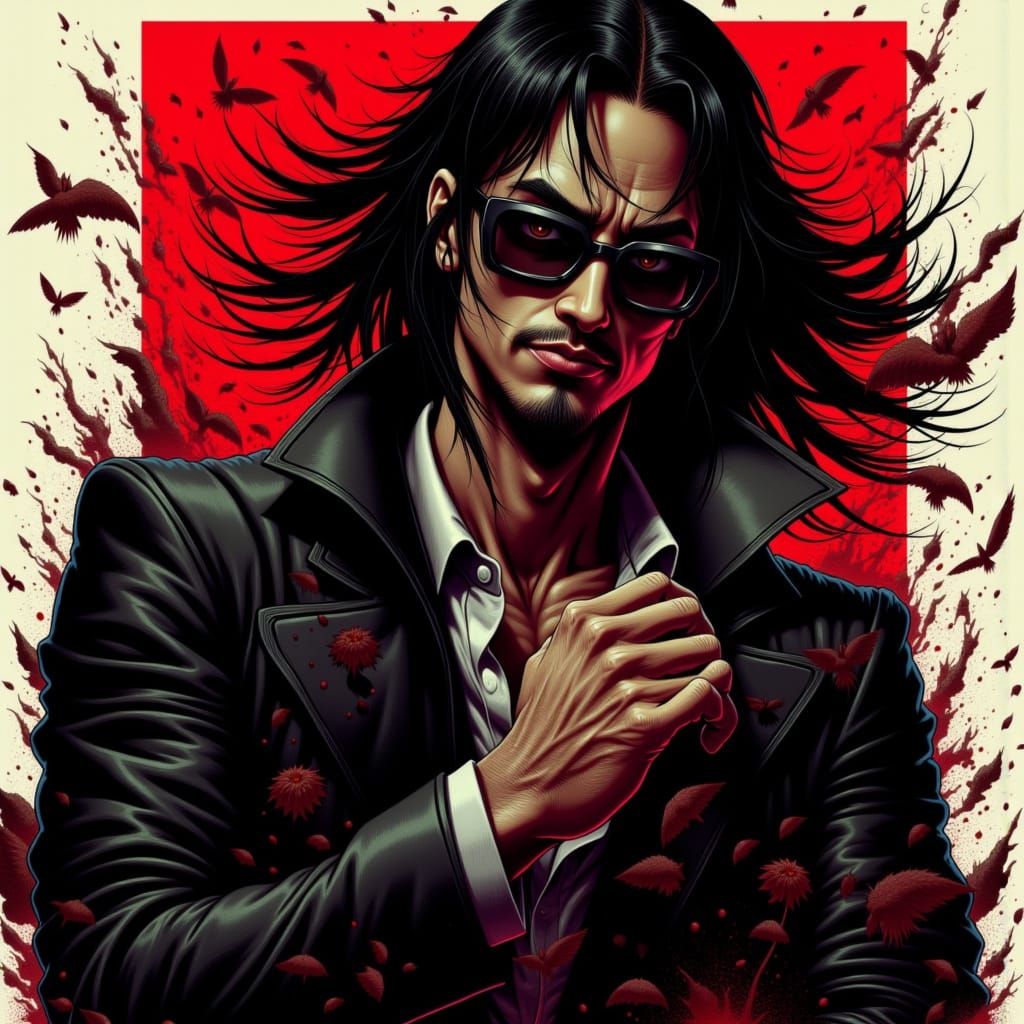 This hyperrealistic image features a muscular Yakuza man with long black hair, posing in a dramatic Bishounen style. Rendered with sharp lines and deep colors, it evokes a graphic novel aesthetic.