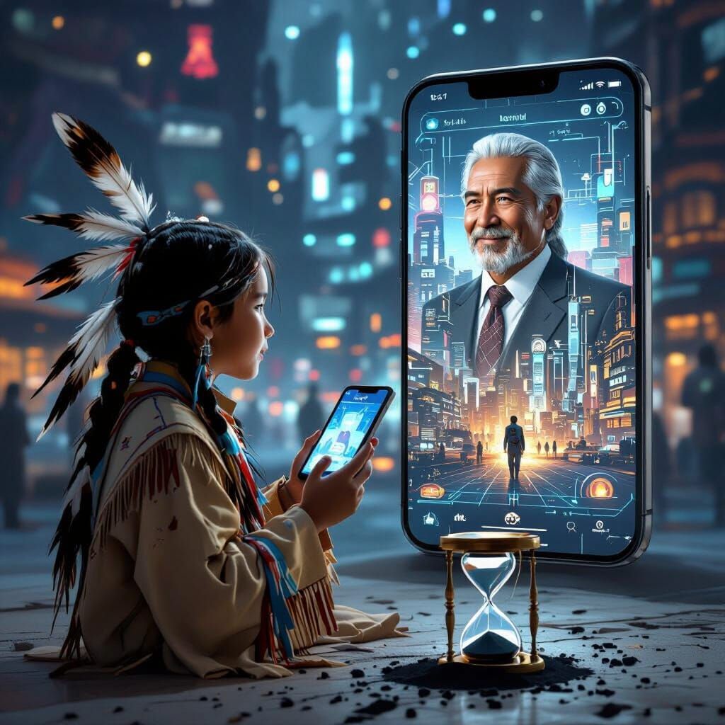This image shows a Native American boy from the 18th century captivated by a smartphone. The screen displays a hologram of his older self in a futuristic cityscape, in a Syd Mead inspired style.