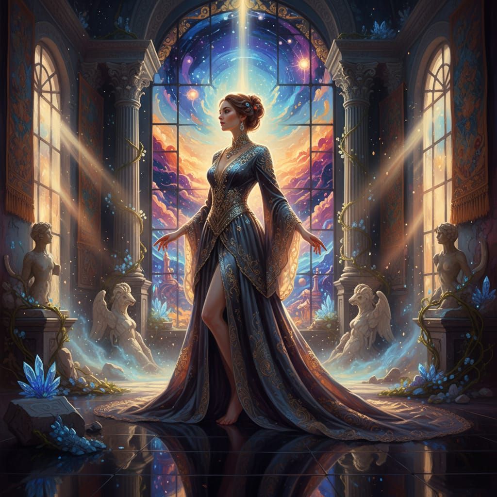 A woman in elegant attire poses in a luxurious studio, bathed in dramatic cinematic backlight and crepuscular rays. The image features intricate details and a delicate oil painting style.