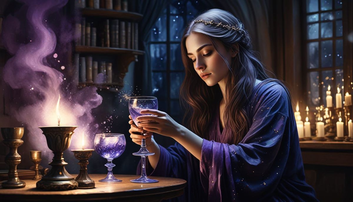 This image shows a young woman with wild eyes pouring stars from a crystal goblet. It features flowing robes and a mystical aura, rendered in deep blues and purples with dramatic, low lighting.