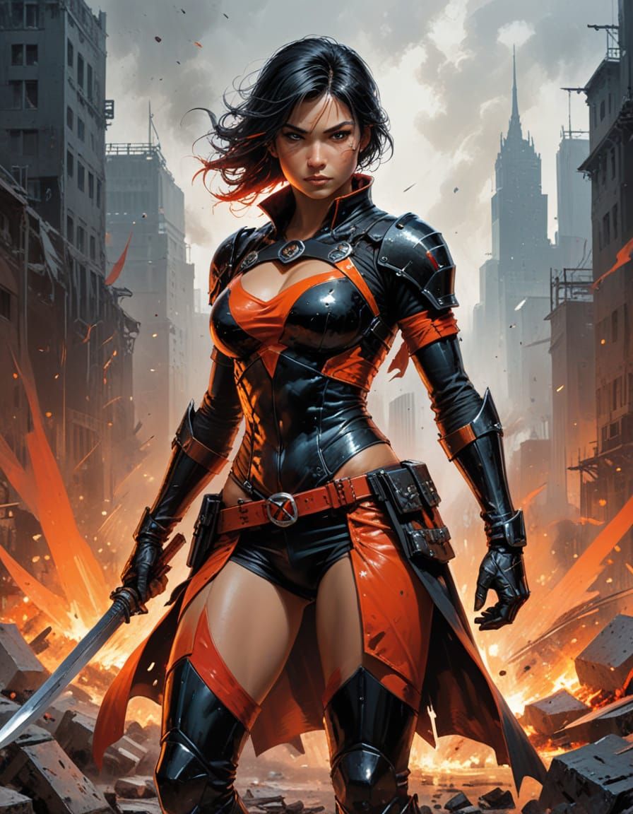 A powerful warrior woman depicted in striking red, black, and orange hues. This artwork features dynamic lines and a bold aesthetic.