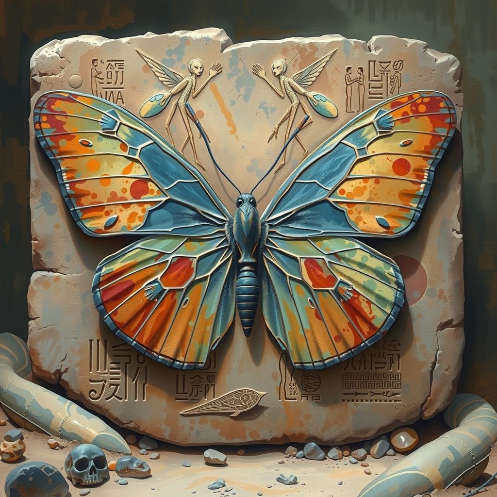 Gouache style. Close-up of a rare butterfly engraved on a clay tablet. deeply engraved Martian hieroglyphics in a minimalist style, featuring intricate carvings of a butterflies and slender alien figures in ritual poses, soft shadows and muted earthy tones, evoking an enigmatic blend of ancient artistry ...