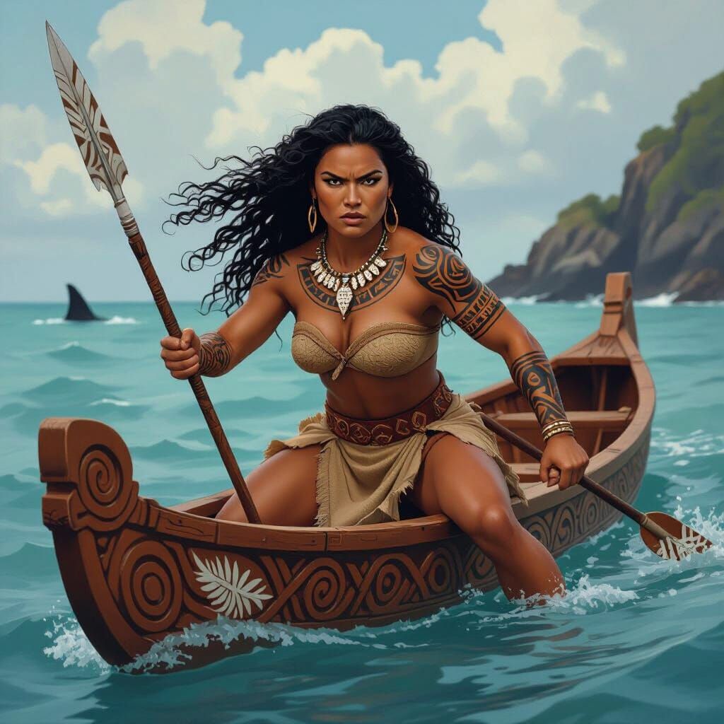 A striking picture of a Maori woman in a carved canoe, holding a spear. She has traditional tattoos and is dressed in traditional clothing, rendered with intricate details inspired by Pacific Islander art.