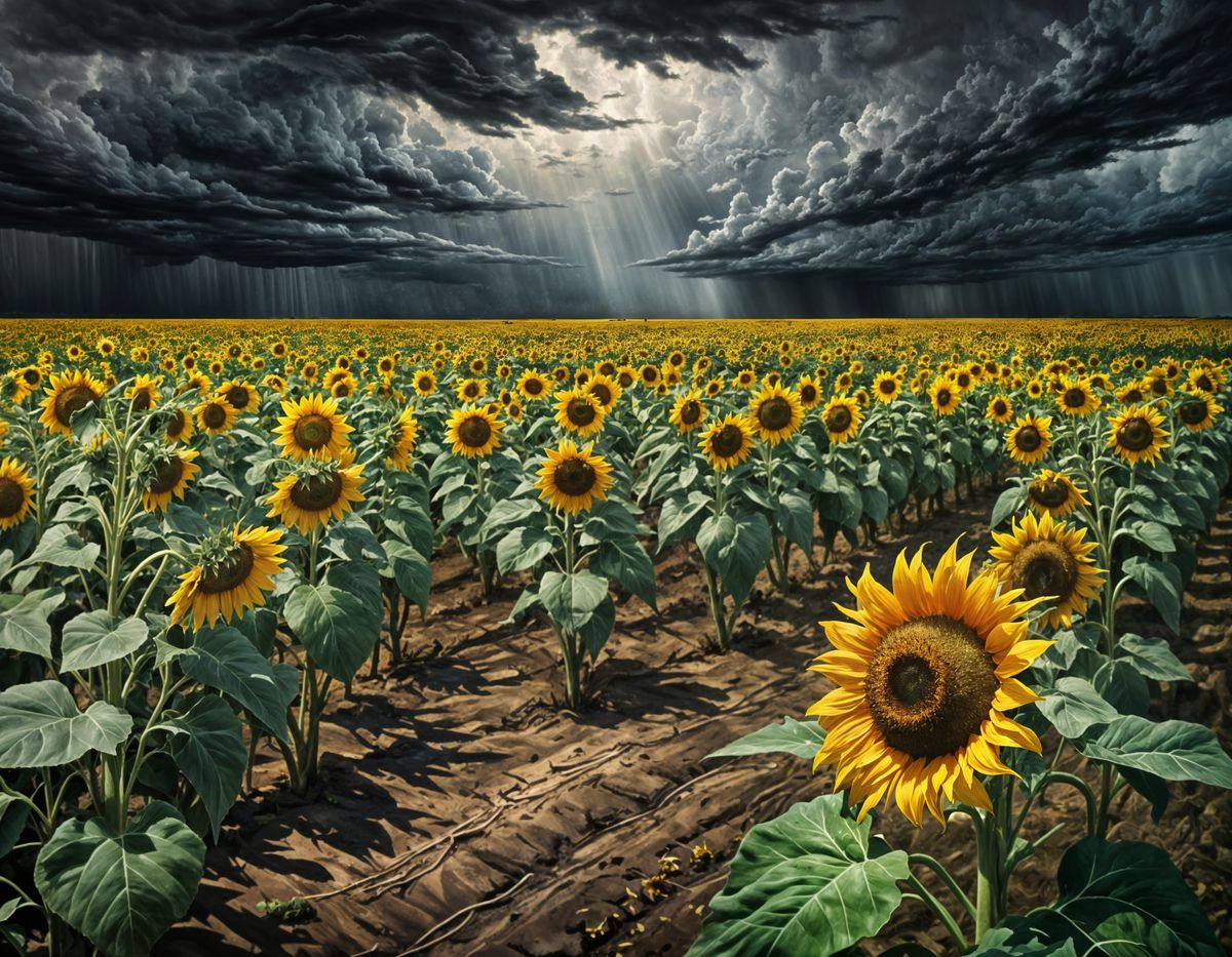 Easily generate your own sunflower field paintings under stormy skies with our free AI image generator.