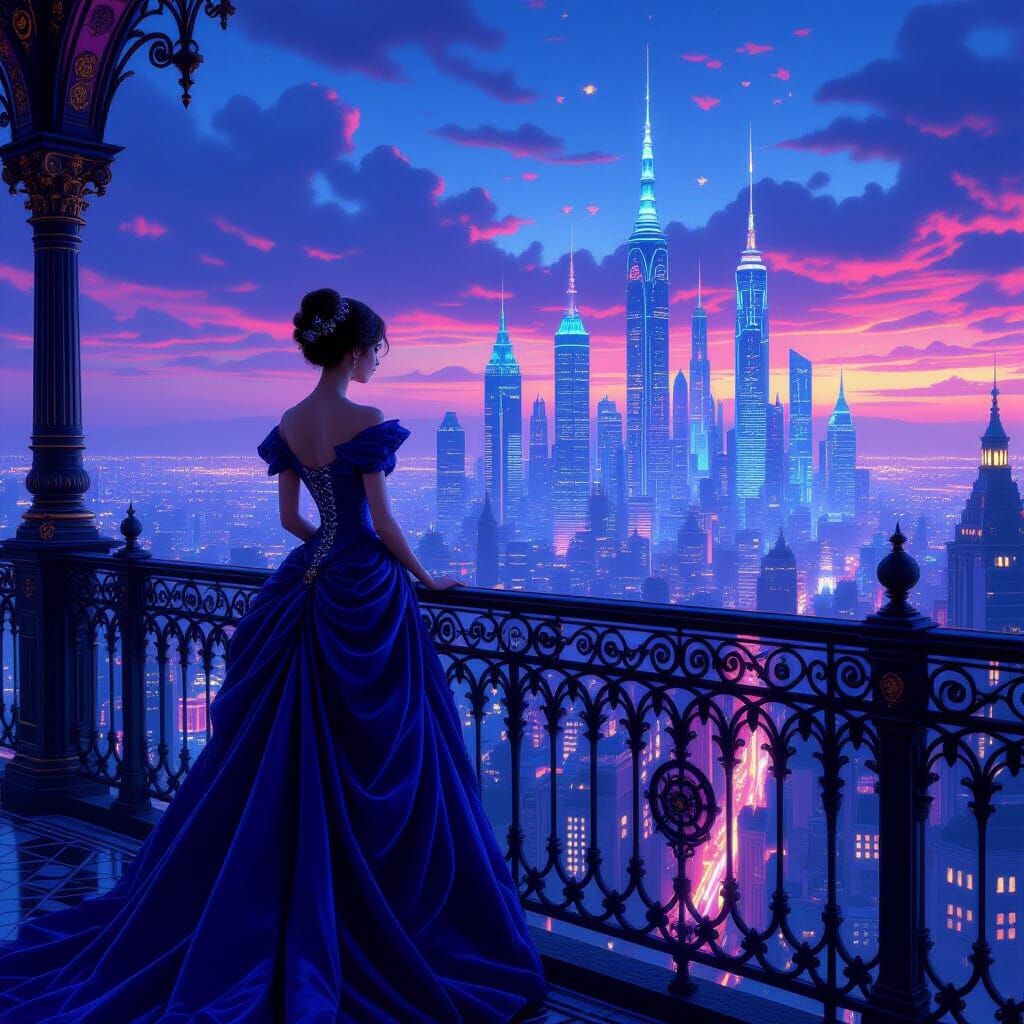 A woman in a sapphire Victorian gown gazes at a futuristic city at dusk. The scene blends steampunk and psychedelic art styles with vibrant neon lights.