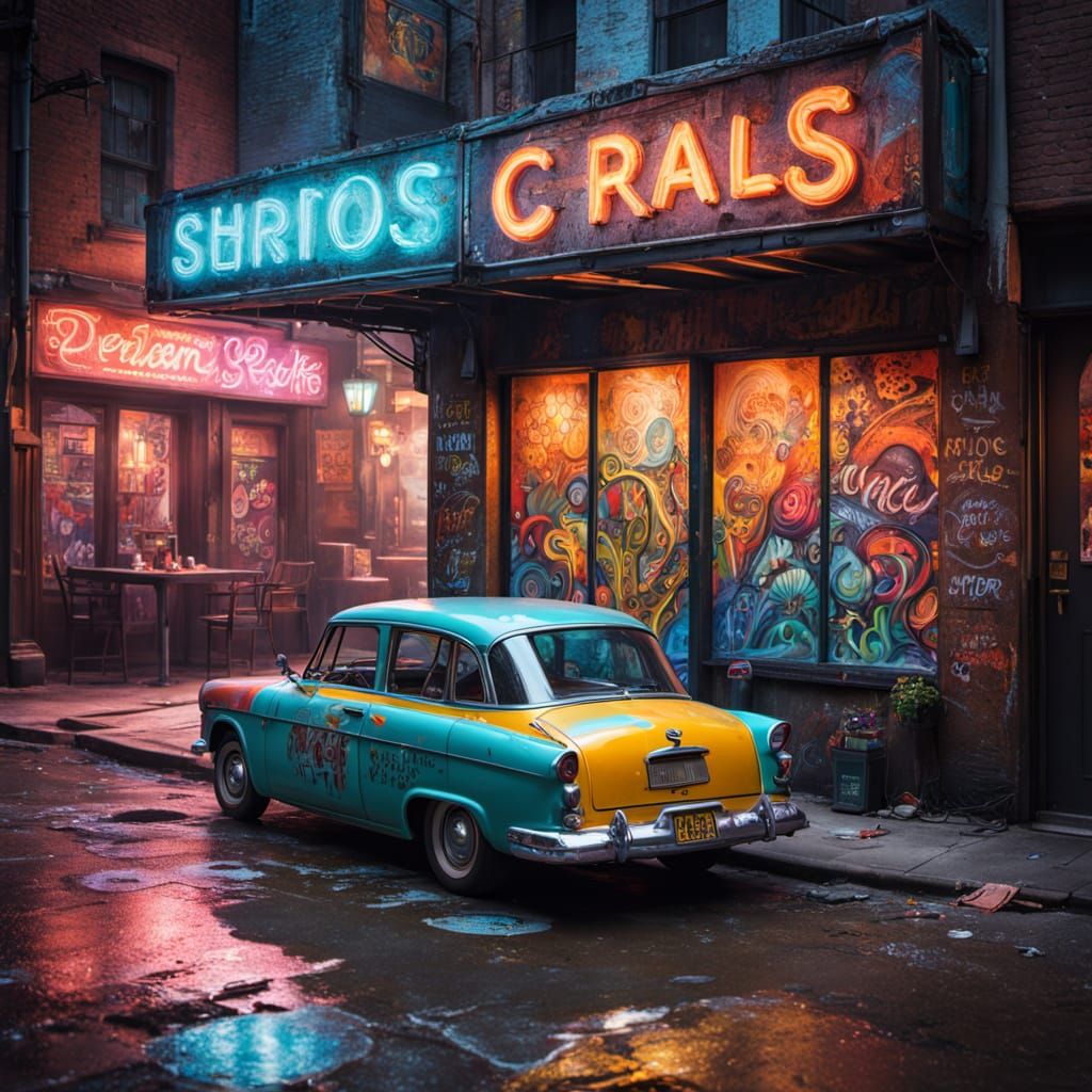 A vibrant image of a fairy-themed dive bar in a colorful alleyway. The scene is rendered in a graffiti art style with melting spray paint and gouache, illuminated by high-contrast, polychromatic neon lights.