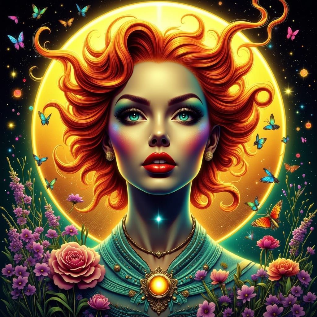 A vibrant, stylized portrait of a flame-haired woman surrounded by a halo of yellow and light green neon light, evoking the spirit of the Twins. Featuring bold, expressive features and a dynamic blend of pulp comic and mythological elements.