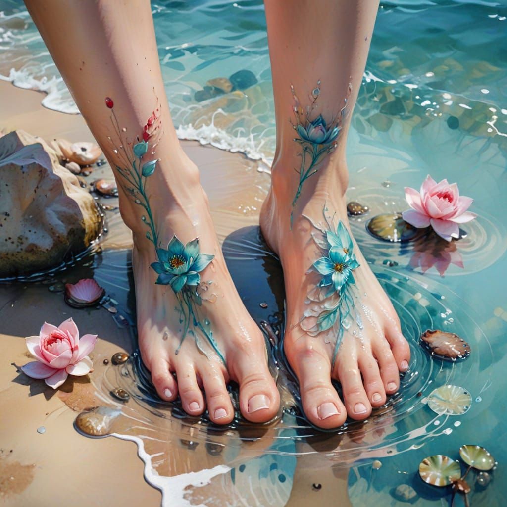 This image shows a woman's feet in clear turquoise water on a tropical beach. One foot features a tattoo of white roses, while the other has a lotus flower tattoo, all rendered in watercolor.