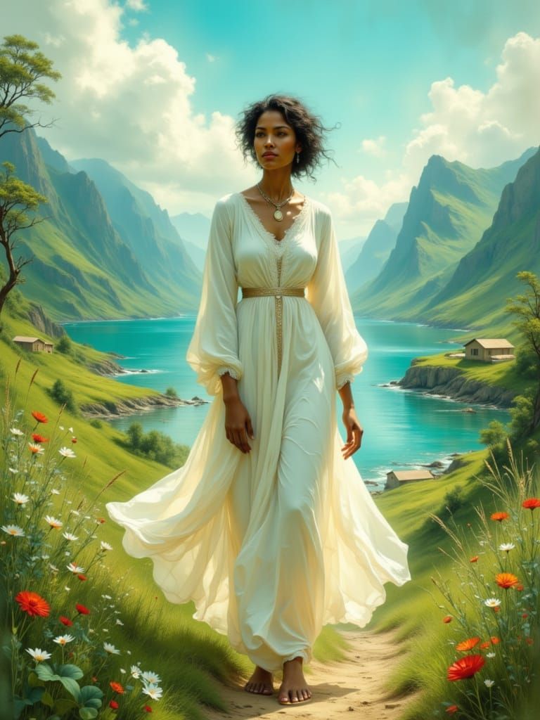 This image shows a serene woman in flowing robes walking through a vibrant landscape. The scene evokes a whimsical, ethereal atmosphere with soft lighting and a color palette of blues, reds, and greens.