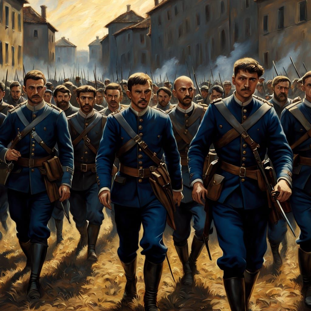 This oil on canvas masterpiece captures soldiers marching in the field under warm golden lighting with deep shadows, evoking the style of Caravaggio. Rich, muted colors and textured brushstrokes bring a sense of intensity and realism to this cinematic artwork.