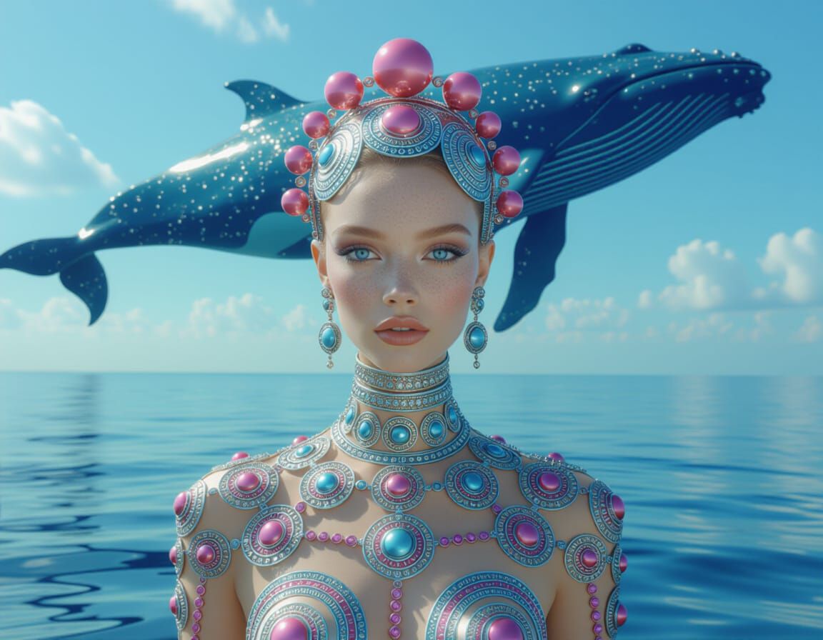 This image shows a futuristic humanoid with blue eyes and intricate body patterns. A fabric-like whale floats in a surreal pink and blue sky. High fashion and romantic drama elements are combined.